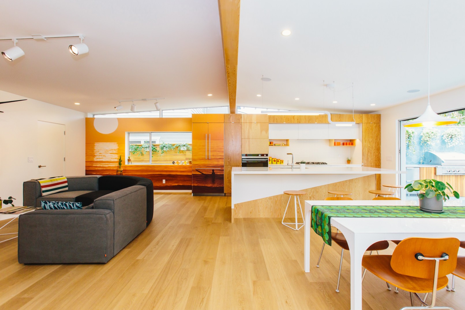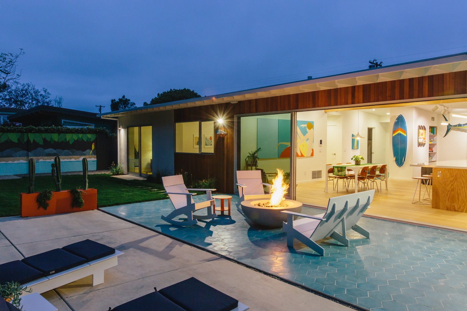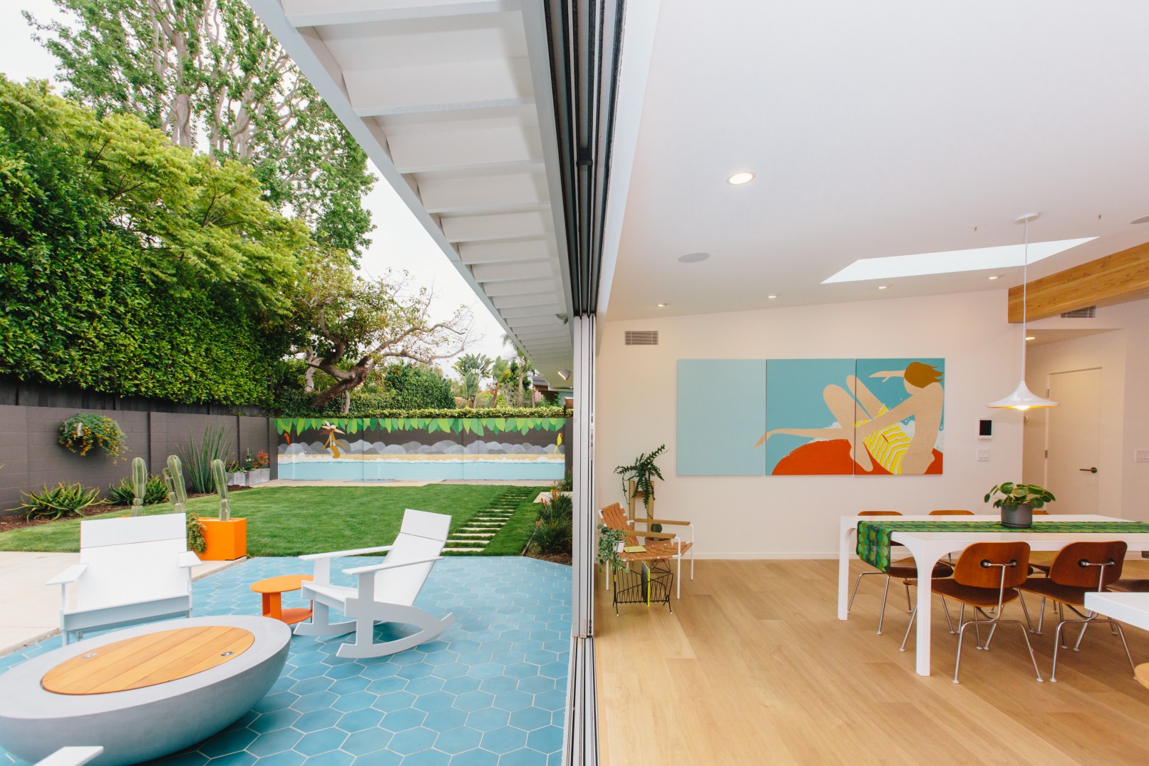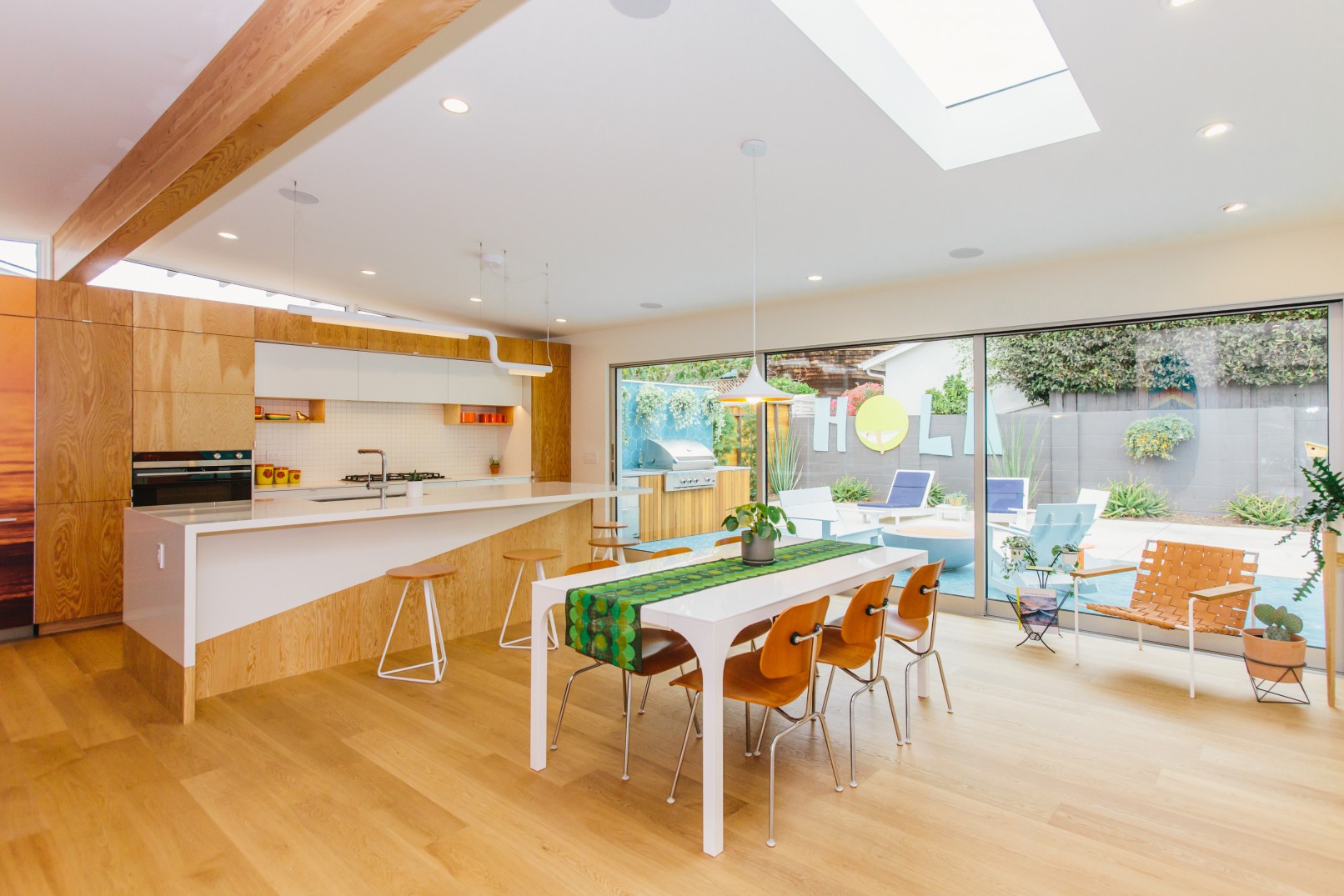 Color, geometry and the material choices of the exterior defines the architectural metaphor of “old meets new” for the Cardiff with A Side of Ranch project. An expanded design layout has liberated the original segmented main living area to a more light-filled & open space. Featuring an expansive galley kitchen + island and oversized sliding glass doors that directs all flow to an outdoor rear patio hang out.