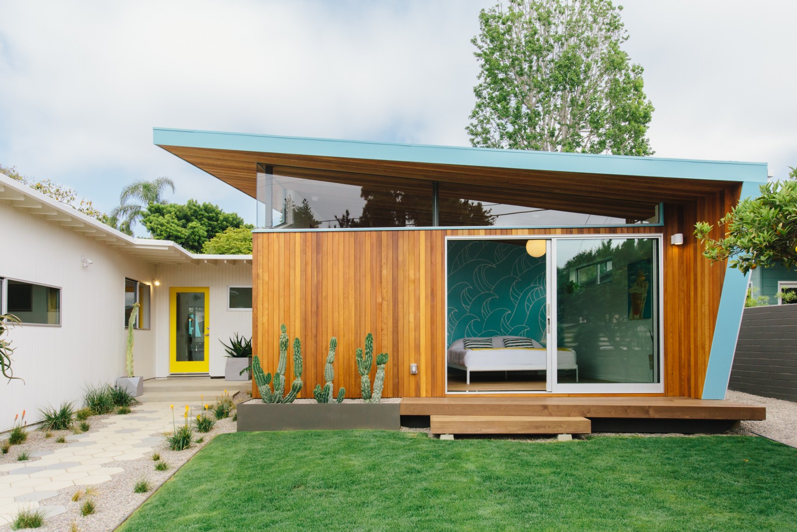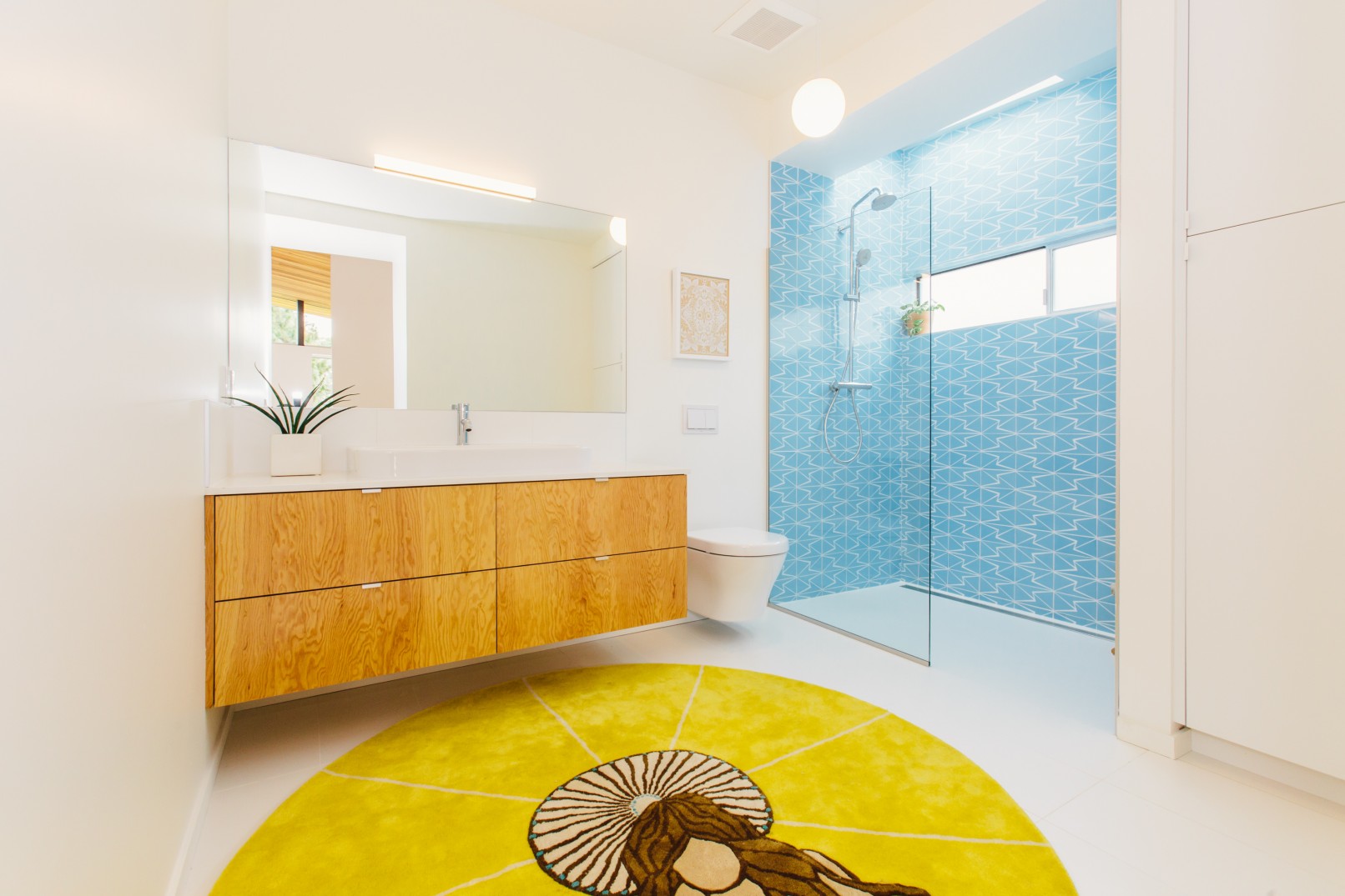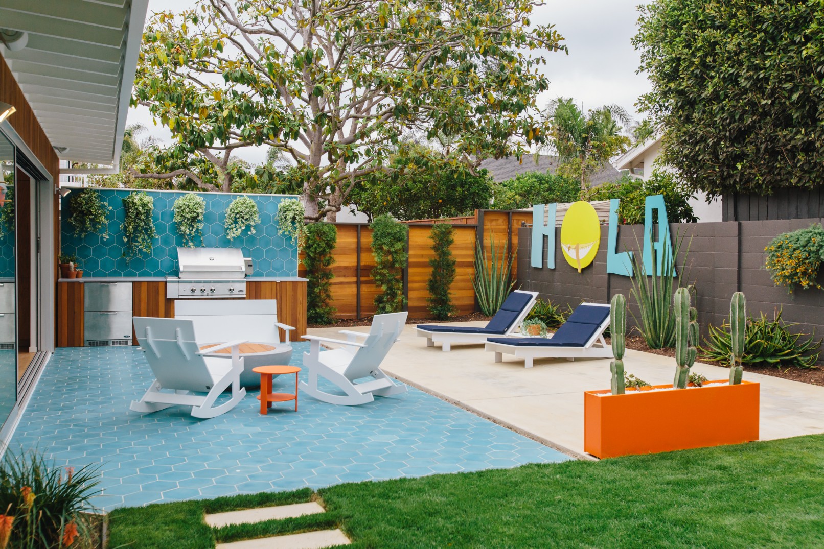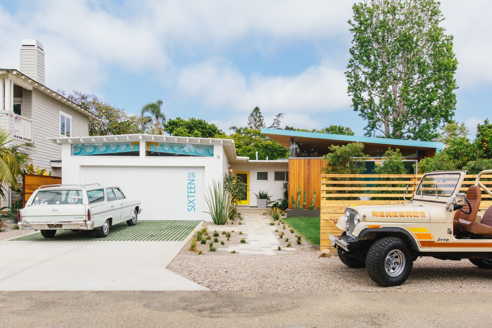 Color, geometry and the material choices of the exterior defines the architectural metaphor of “old meets new” for the Cardiff with A Side of Ranch project. An expanded design layout has liberated the original segmented main living area to a more light-filled & open space. Featuring an expansive galley kitchen + island and oversized sliding glass doors that directs all flow to an outdoor rear patio hang out.