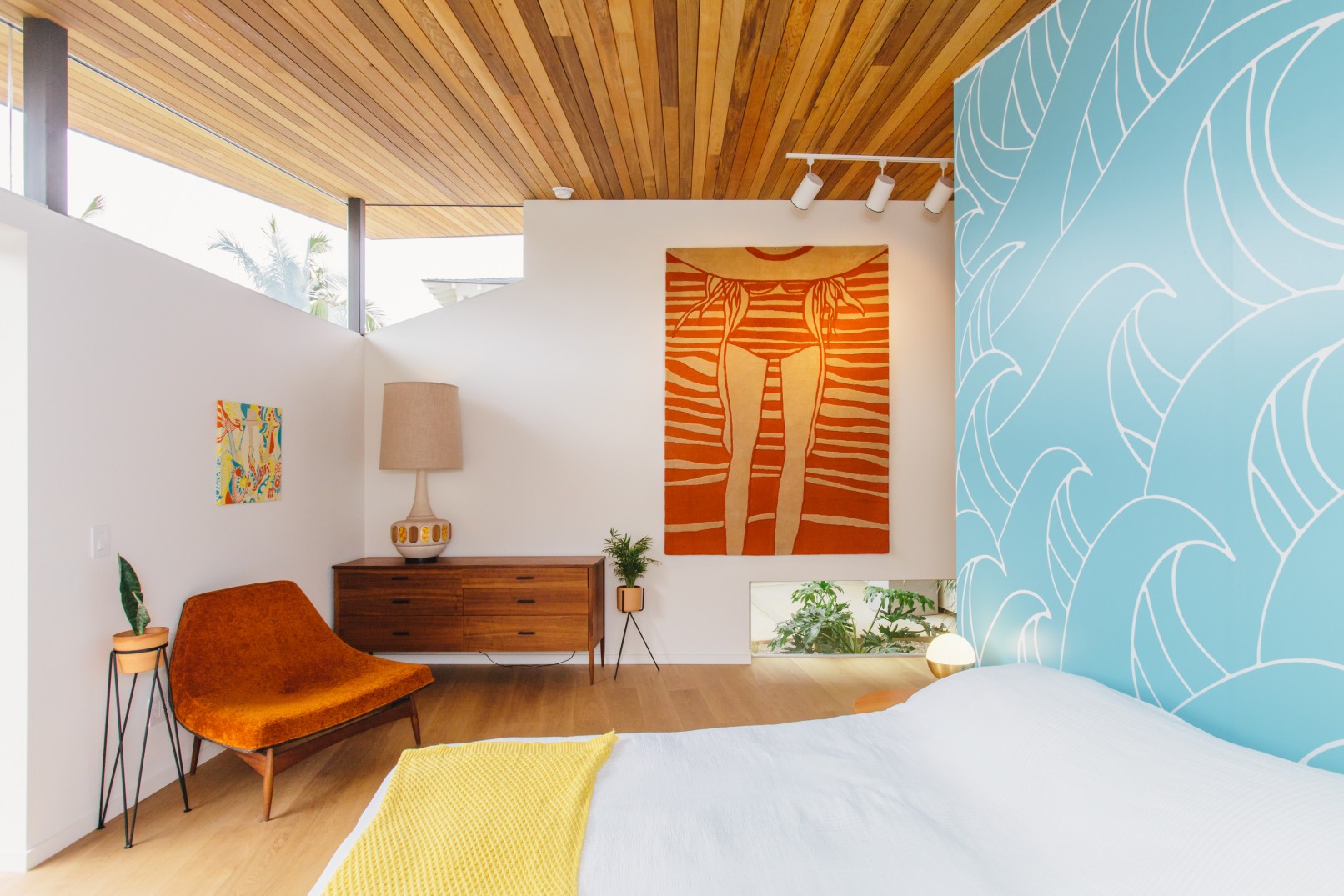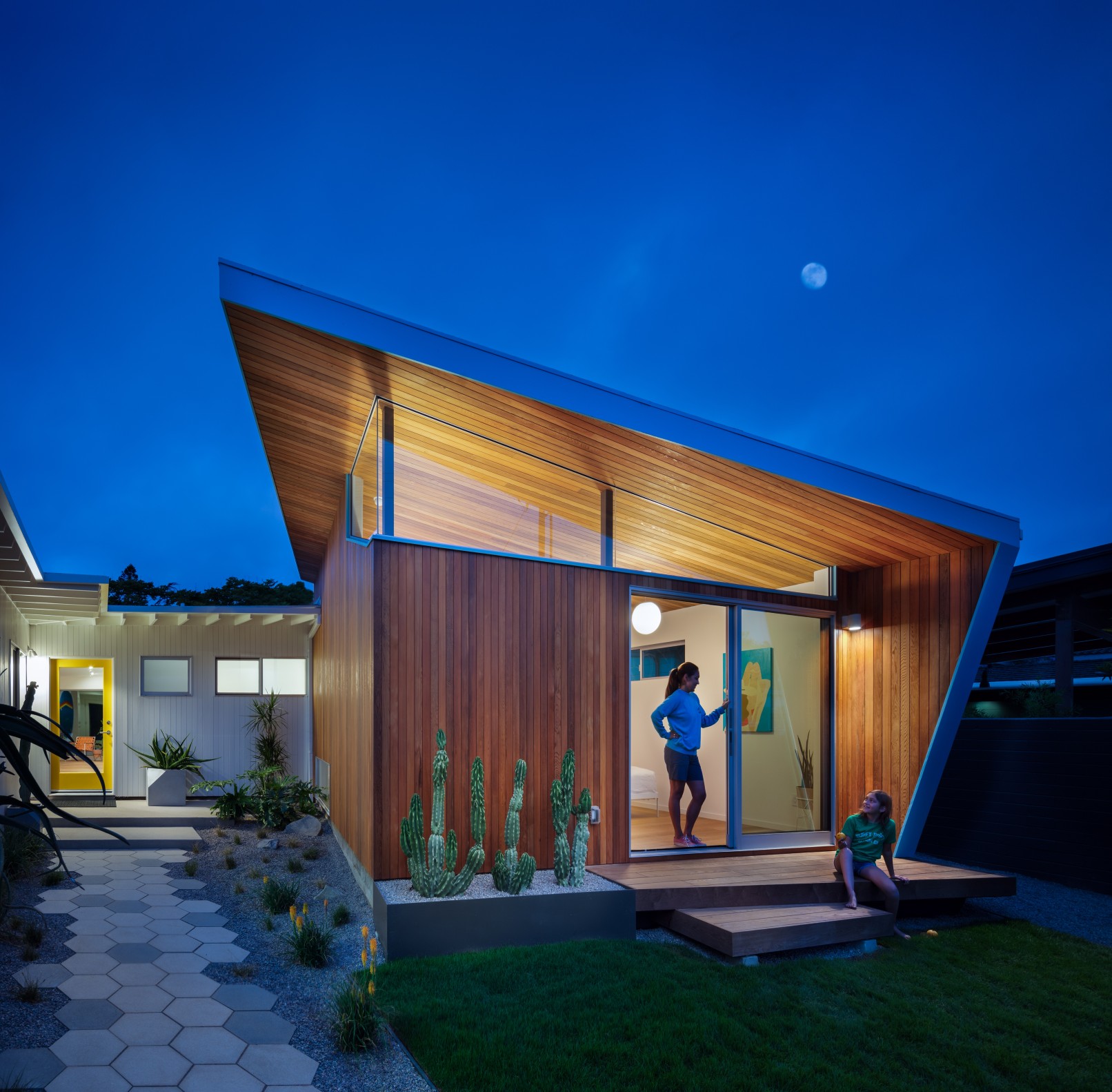 The new 380 sqft master bedroom allows for an angled wood ceiling in with warp around clerestory glass. The indoor palette supports the concept of a modernist house with prominent natural wood materials, crisp white walls and visible exposure of the home’s structural components. Precision of these details are assuring to the quality of the trades involved. Outside, an original elbowed asphalt driveway was replaced by a usable green space and a permeable grass driveway was relocated . Landscaping was dedicated to specifying low mow/drought tolerant/water wise native grasses, succulents and cacti.