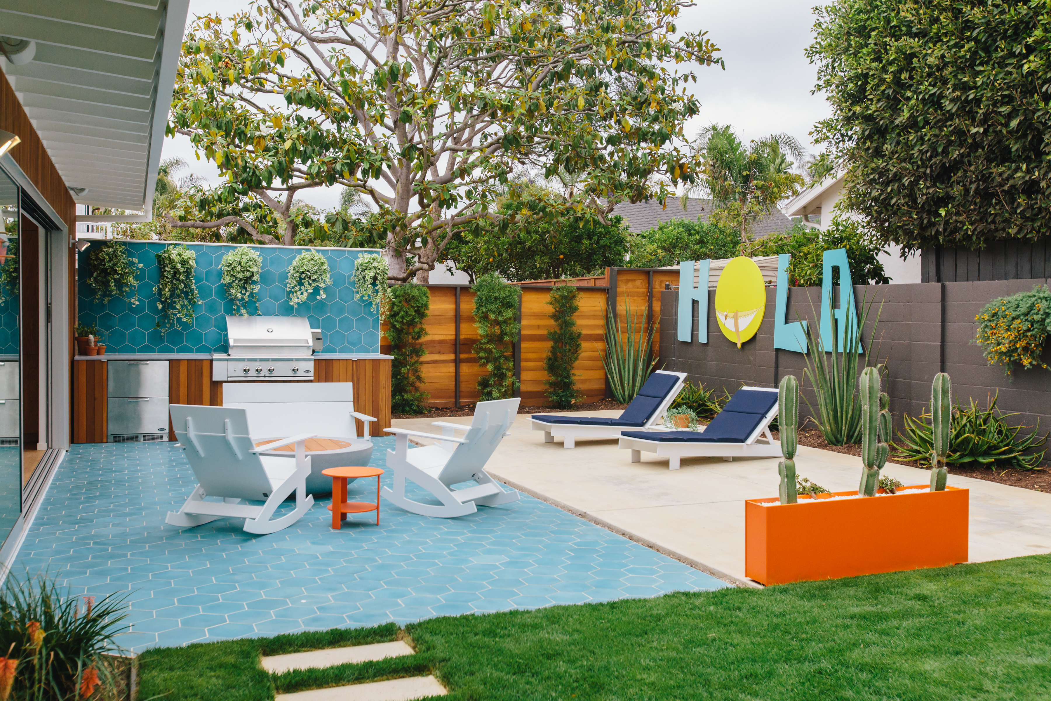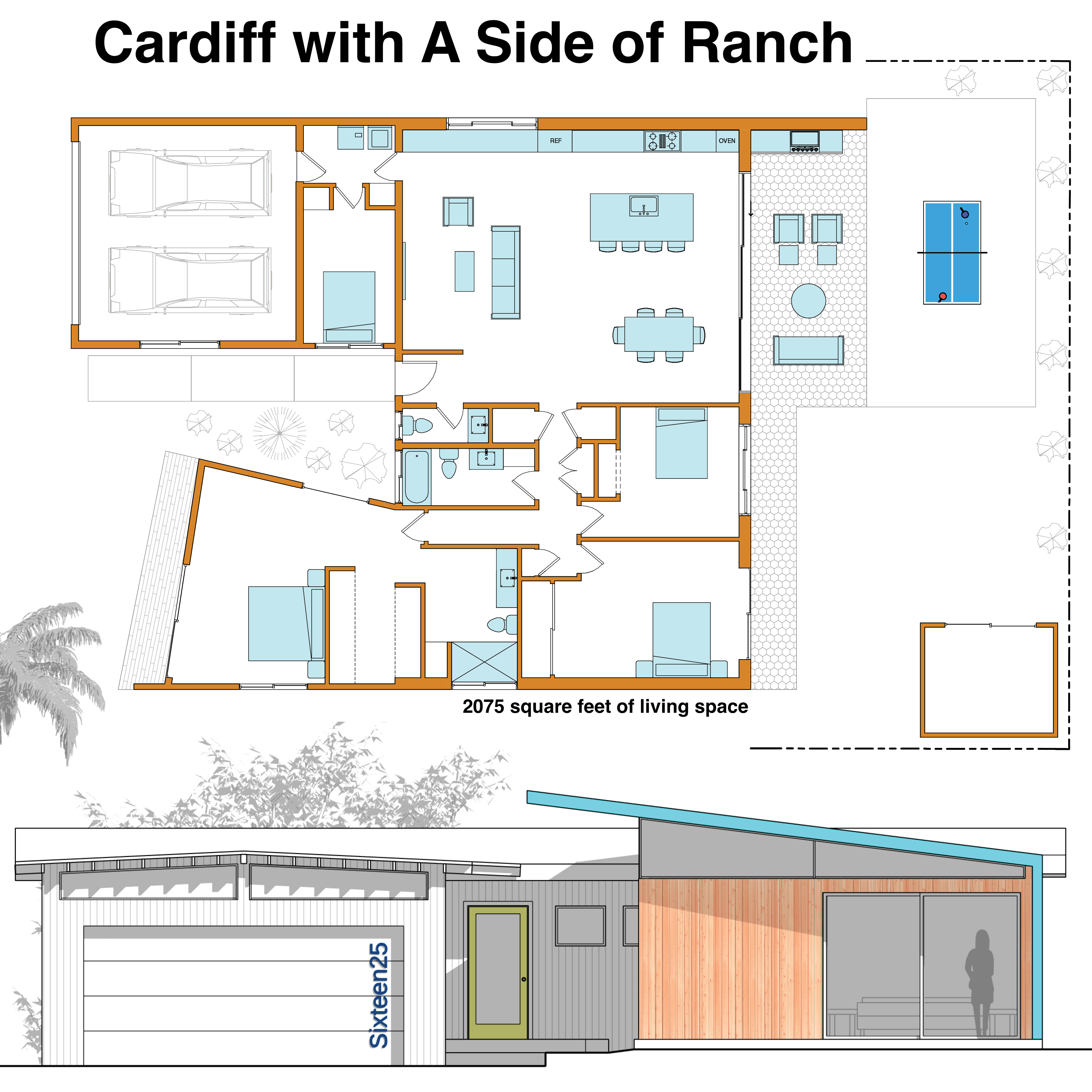 Color, geometry and the material choices of the exterior defines the architectural metaphor of “old meets new” for the Cardiff with A Side of Ranch project. An expanded design layout has liberated the original segmented main living area to a more light-filled & open space. Featuring an expansive galley kitchen + island and oversized sliding glass doors that directs all flow to an outdoor rear patio hang out.
