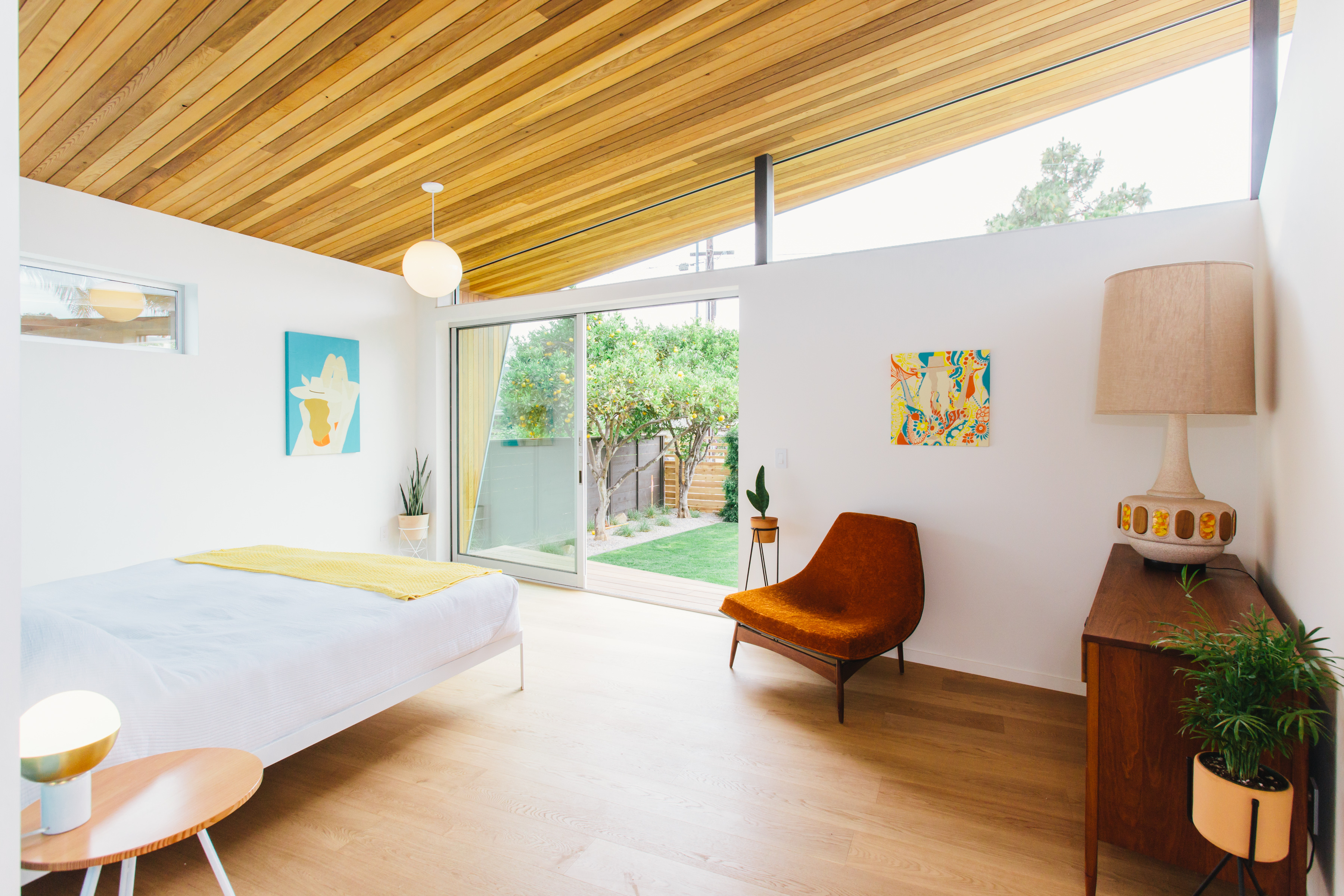 The new 380 sqft master bedroom allows for an angled wood ceiling in with warp around clerestory glass. The indoor palette supports the concept of a modernist house with prominent natural wood materials, crisp white walls and visible exposure of the home’s structural components. Precision of these details are assuring to the quality of the trades involved. Outside, an original elbowed asphalt driveway was replaced by a usable green space and a permeable grass driveway was relocated . Landscaping was dedicated to specifying low mow/drought tolerant/water wise native grasses, succulents and cacti.