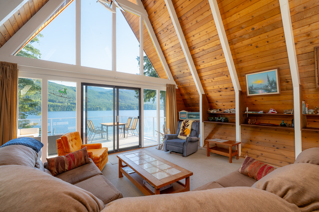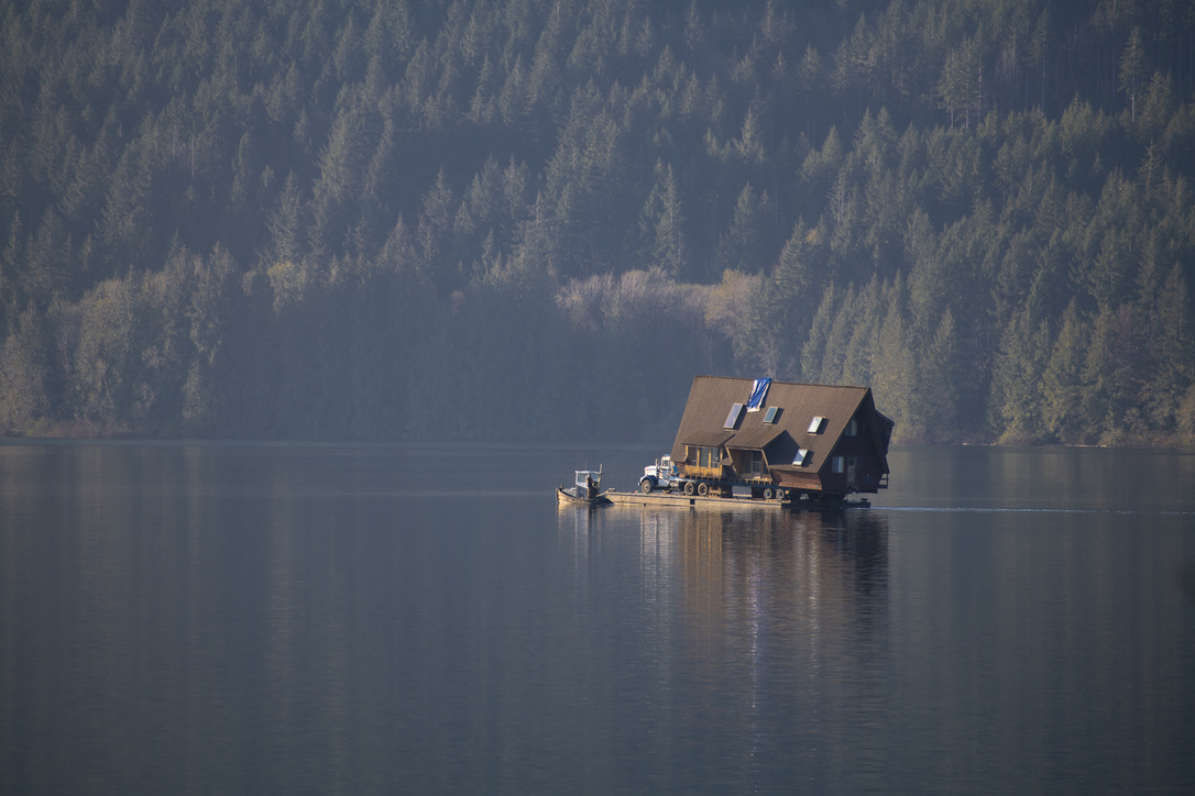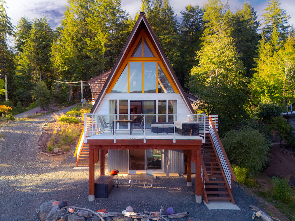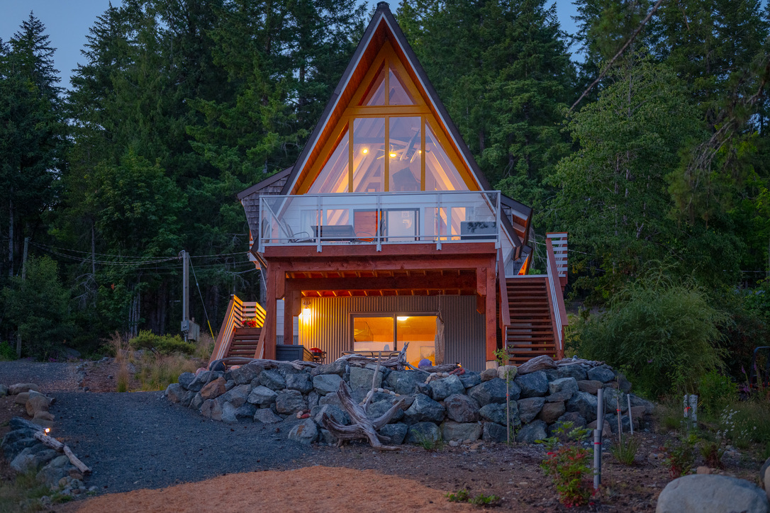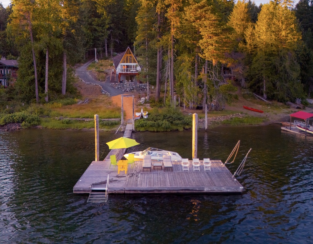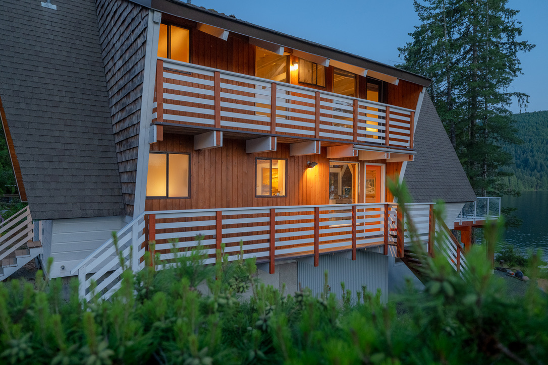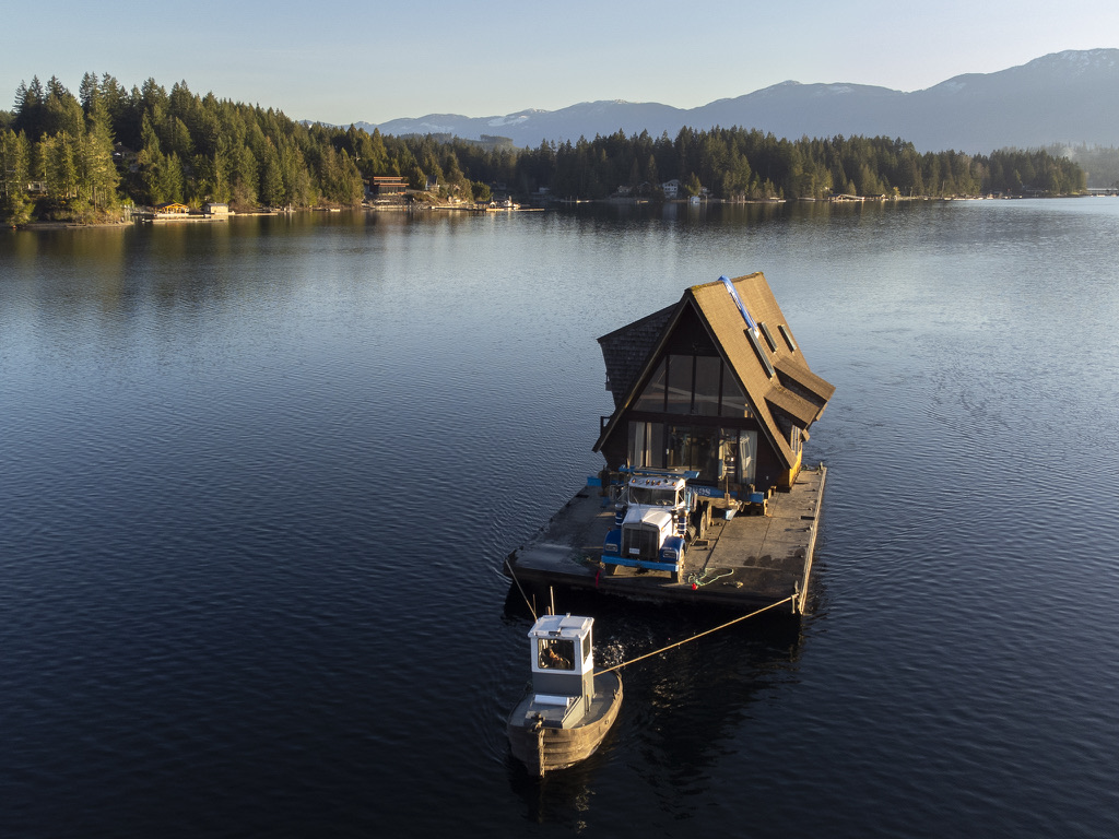 A timely phone call discovered a family on the same lake who wanted to recycle their 1968 A-frame cabin. What followed was six months of team planning, engineering logistics & the convincing of the local Building Department. Highly skilled contractors took four weeks to prepare two separate waterfront lots for the structural move. A modular floating barge and tugboat took 2 hours to complete the 4 nautical mile journey across Sproat Lake, BC without issue.