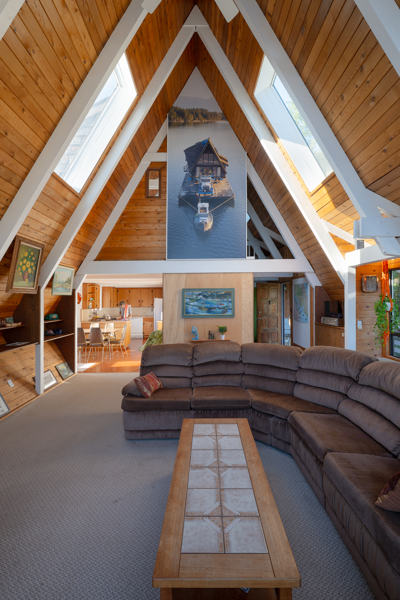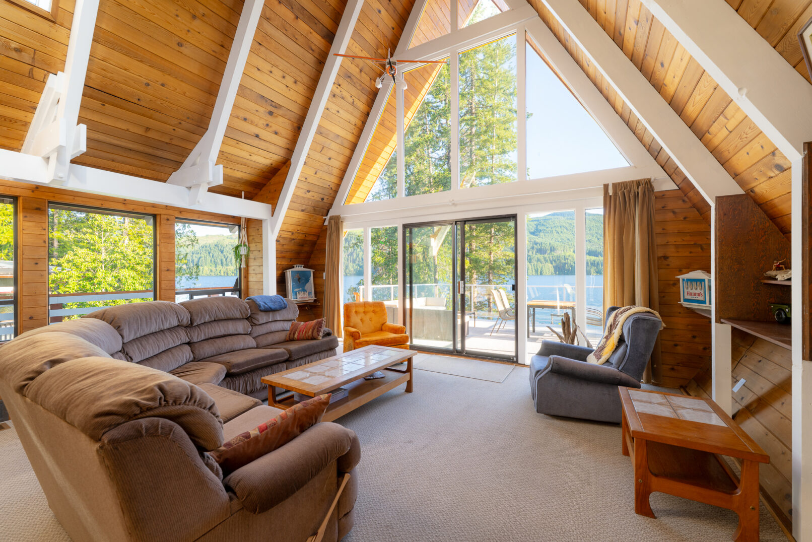 Up-cycling started with a new concrete basement built directly under the cabin while it safely rested on steel beams and wood cribbed posts. Extensive sanding and re-staining of all the cedar walls and exterior vertical siding refreshed the cabin’s natural glow. Period correct furniture and artwork added more character. The steep angled shape with its twenty-one foot high glass wall has some drawbacks, yet it does embody the iconic leisure cabin on a lake.